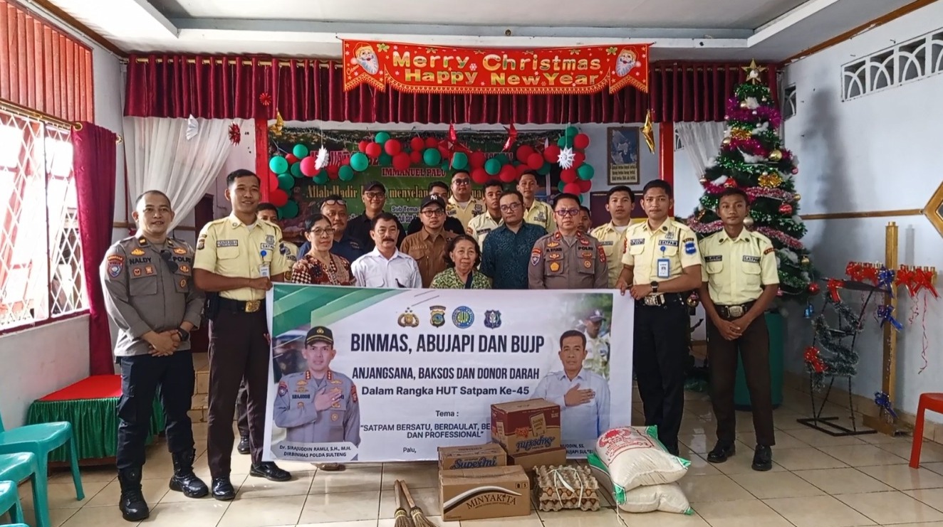 Palu – Dalam rangka memperingati Hari Ulang Tahun (HUT) Ke-45 Satuan Pengamanan (Satpam), Direktorat Pembinaan Masyarakat (Ditbinmas) Polda Sulawesi Tengah (Sulteng) bersama Panitia Penyelenggara HUT Satpam menyelenggarakan rangkaian kegiatan bakti sosial dan anjangsana, Senin 29/12/2025.